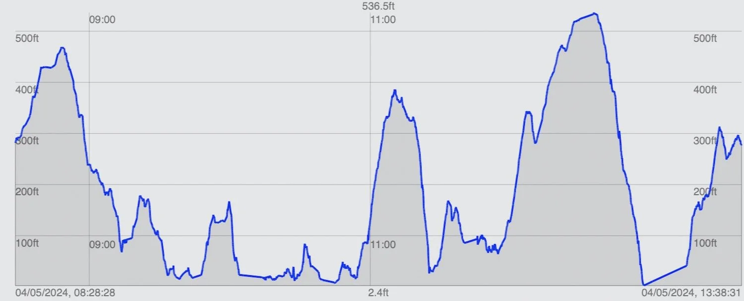 The total ascent today has been 664 feet or 202 metres.